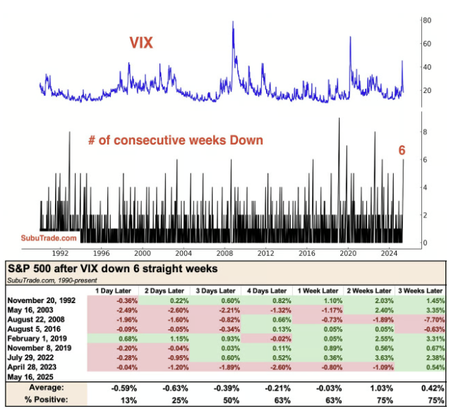 지난 1990년부터 사례를 확인해보면, 6주 연속 하락한 VIX는 단기간 조정을 불러온다.