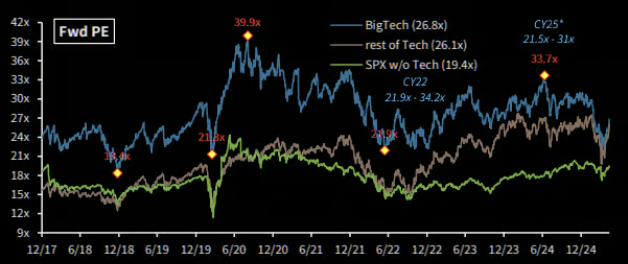 빅테크는 여전히 24년 말에 비해서 낮은 밸류에이션을 받고 있다.