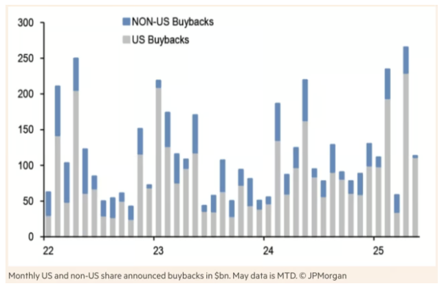 JP 모건 데이터에 의하면 지난 4월, S&P500의 급락과 함께 기업들의 자사주 매입이 폭발적이었다는 것을 알 수 있다.