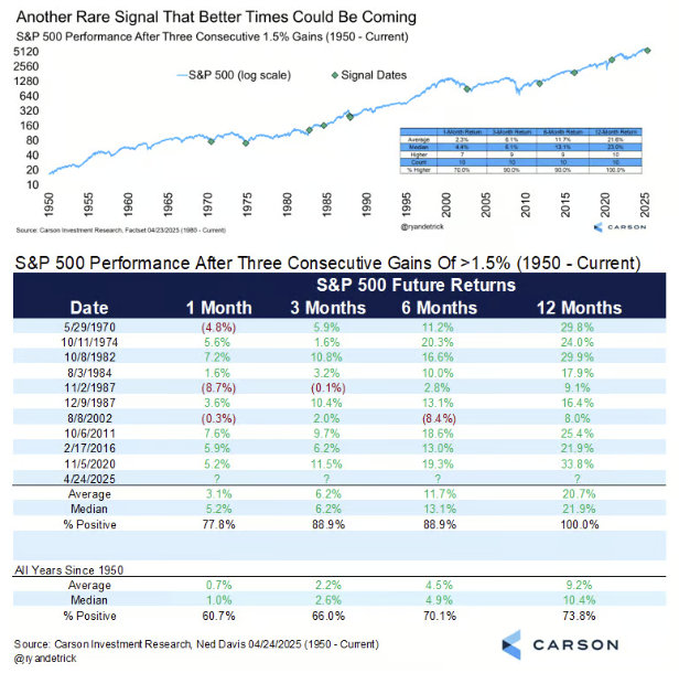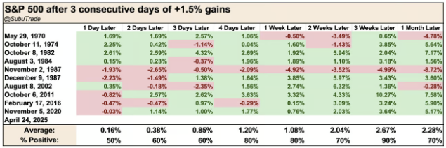 지난 화요일부터 목요일까지 S&P500 지수가 3일 연속으로 최소 1.5% 상승했다.