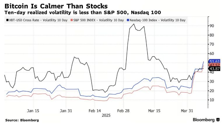 현재는 비트코인이 주식보다 변동성이 적은 자산의 모습을 보이고 있다.