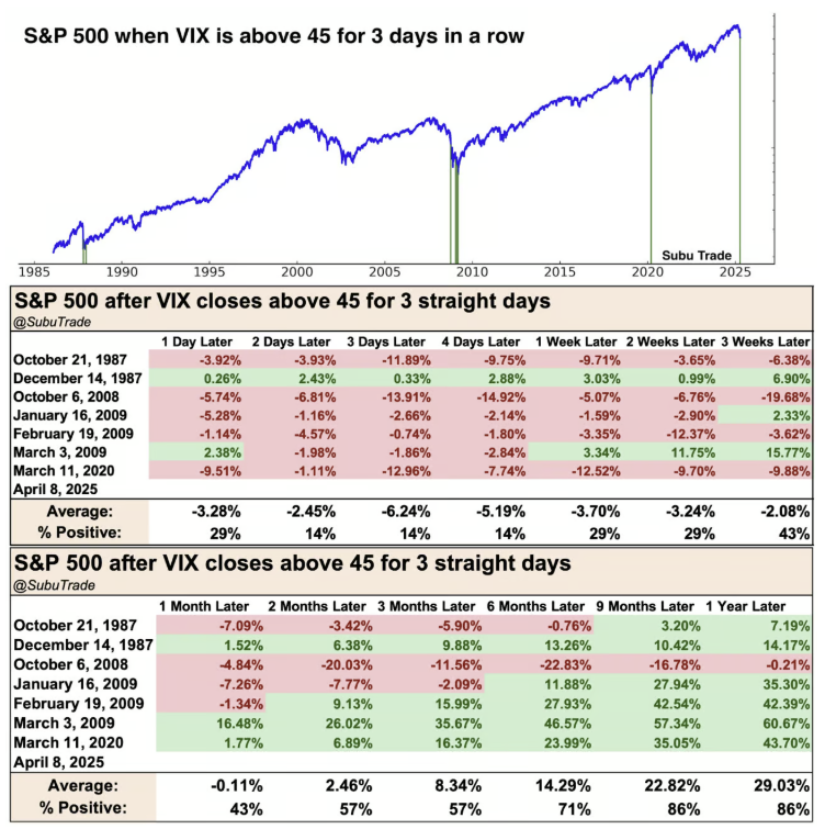 VIX가 3일 연속 45이상으로 마감한 이후의 S&P500의 움직임이다.