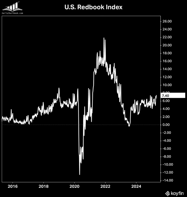 4월 19일로 끝나는 한주동안 미국의 매장 소매판매는 전년 동기대비 7.4%나 증가했다.