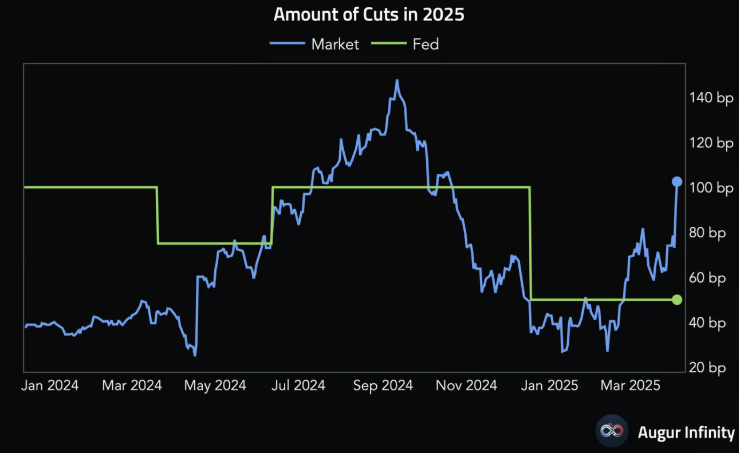 시장은 현재 연준이 코멘트한 2회 금리인하를 믿지 않는다.