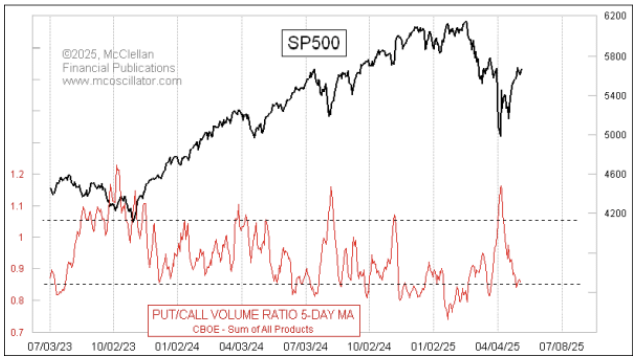 풋/콜 비율의 5일 이평선은 다시 하한선으로 내려왔다.